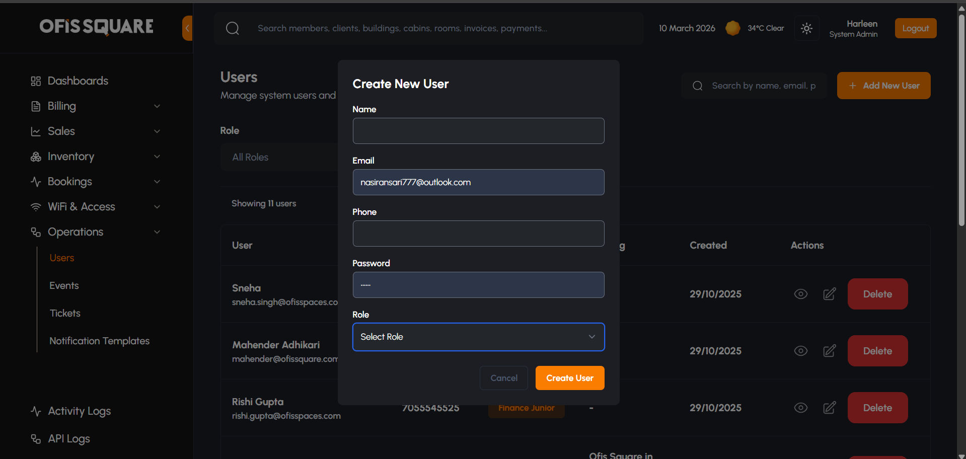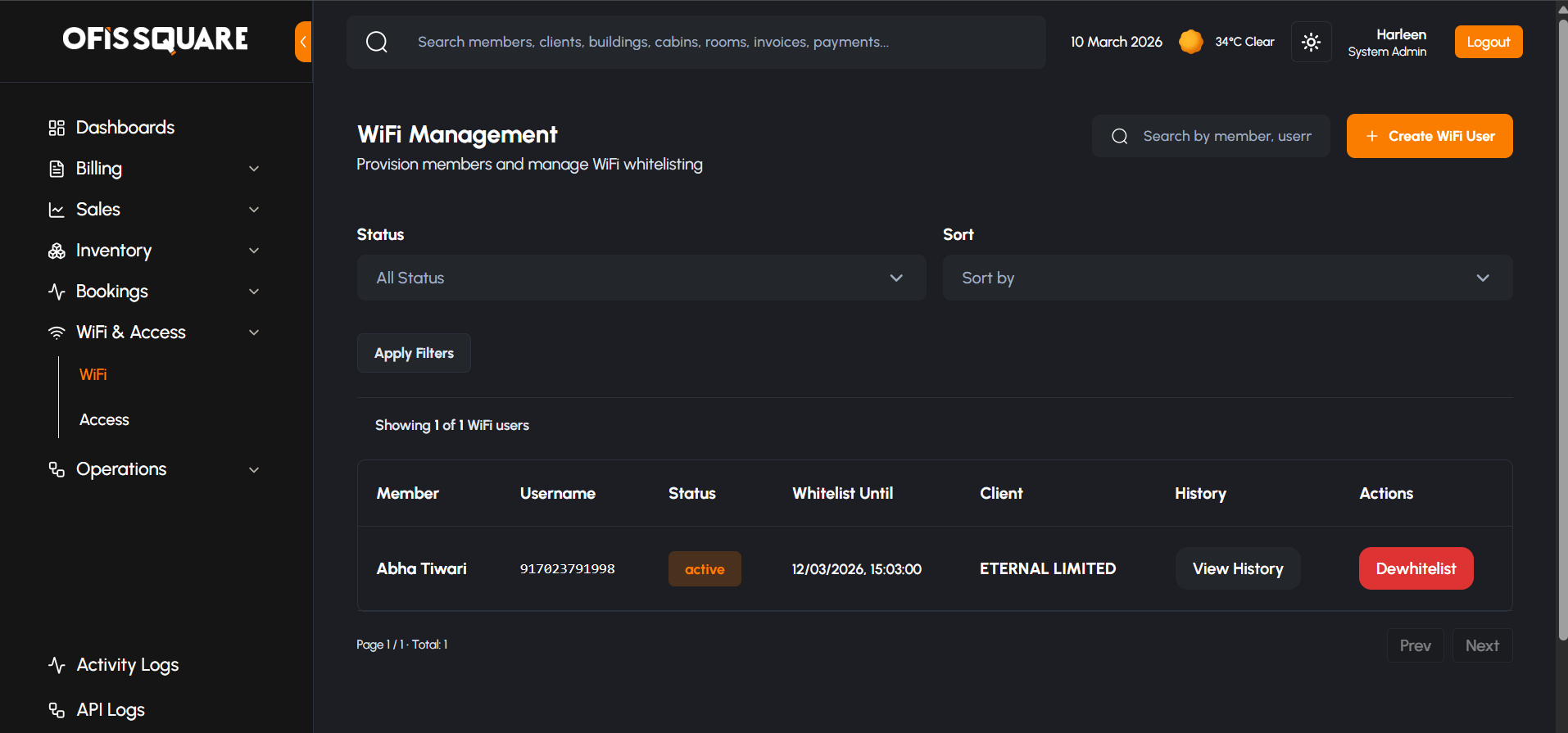 - WiFi User Creation: Admins can provision new WiFi credentials for active members, linking them to their respective contracts.