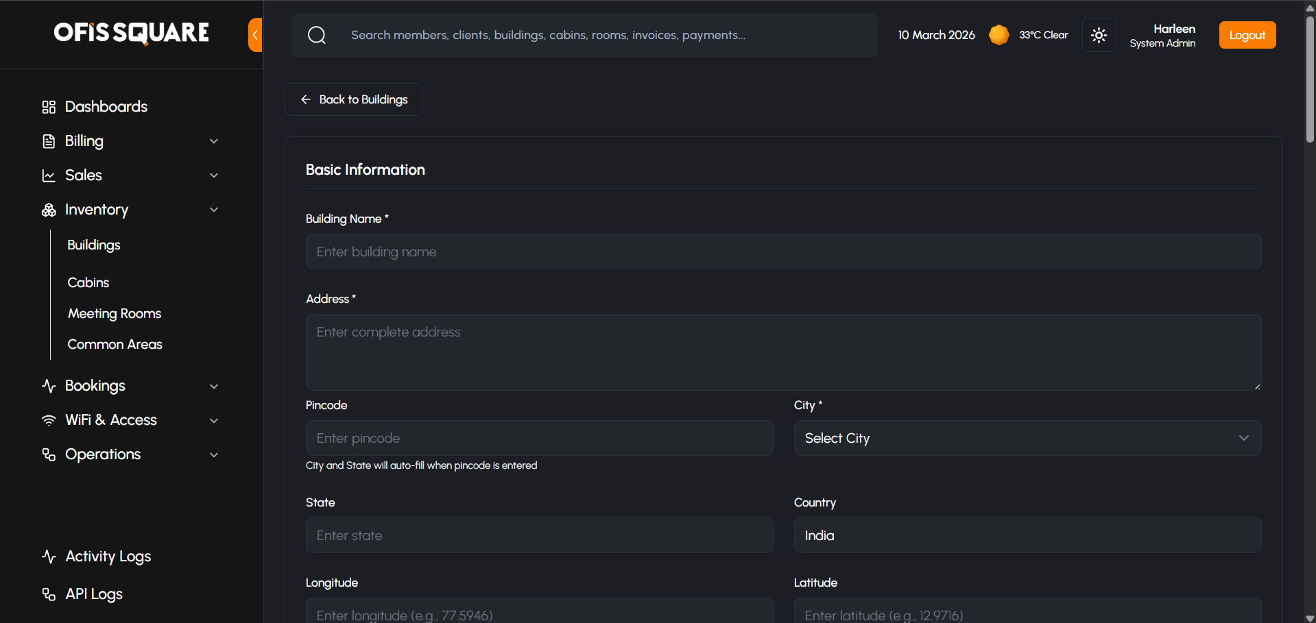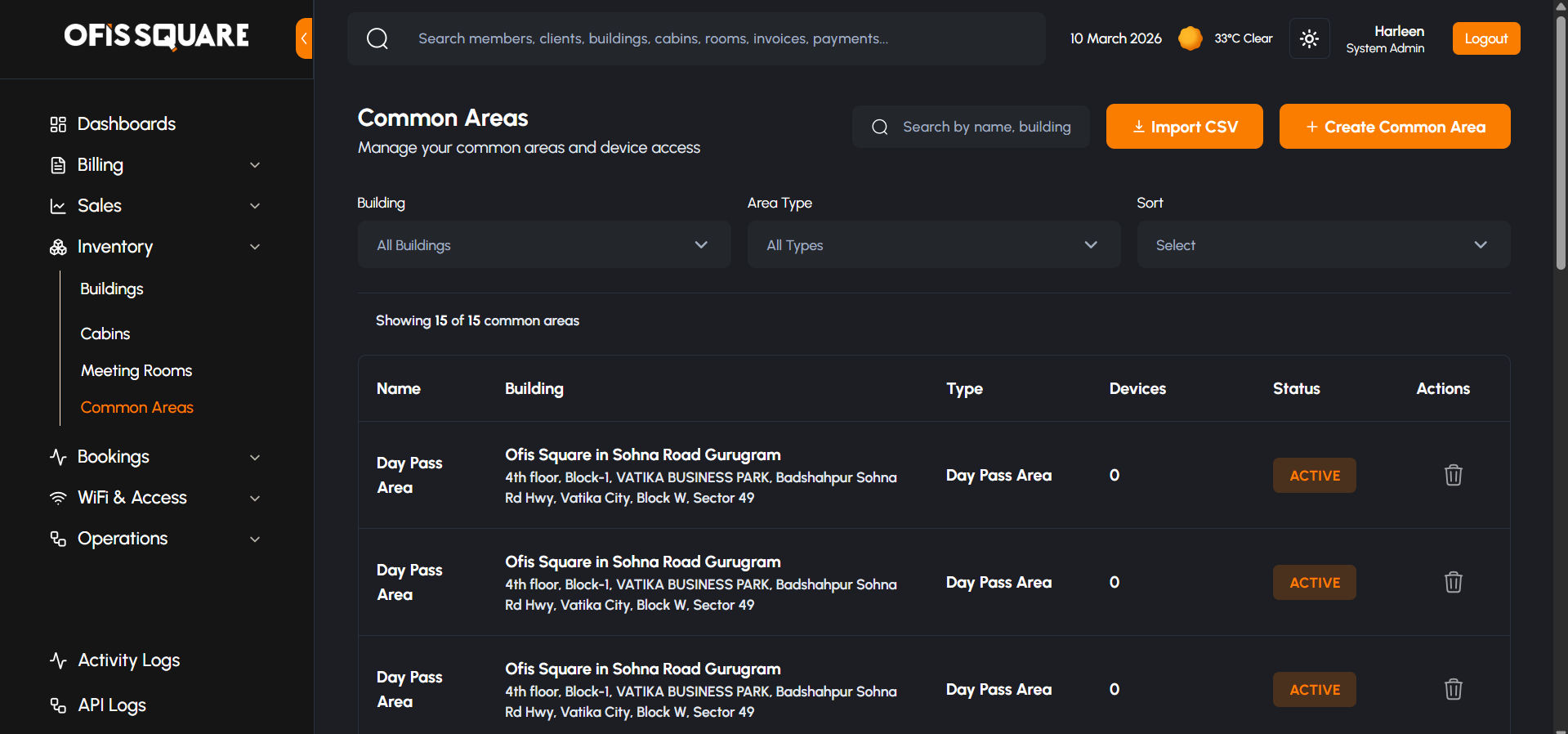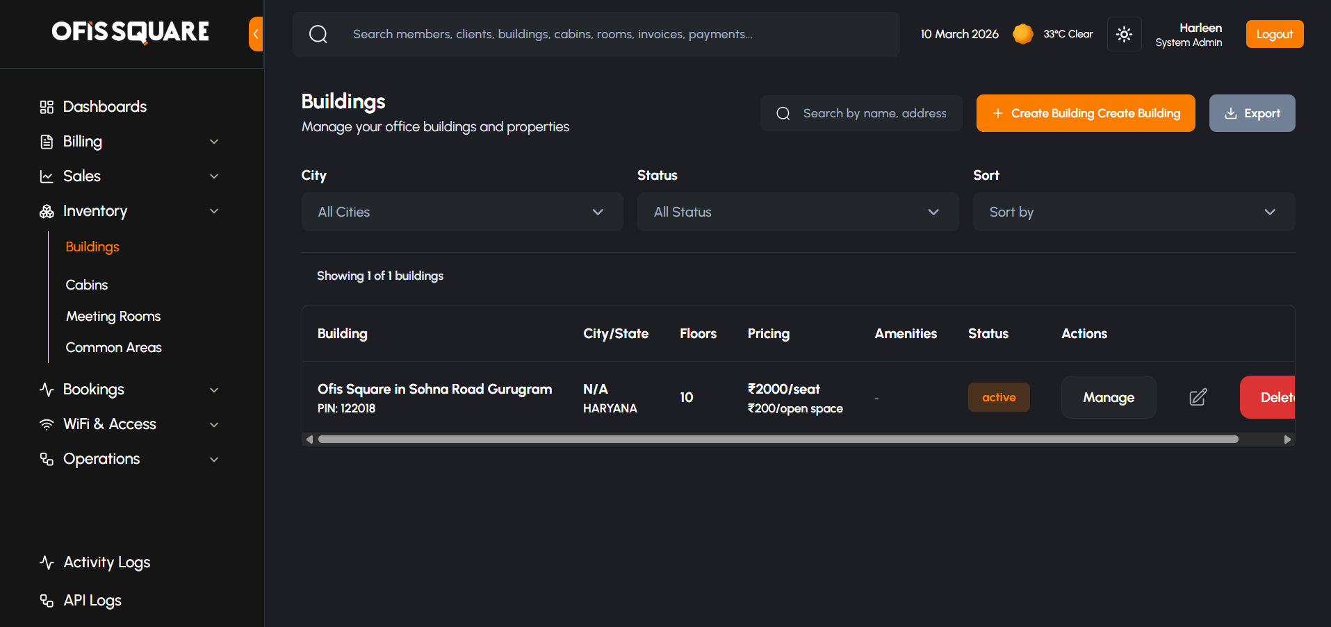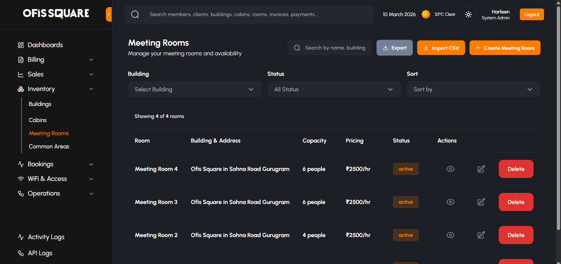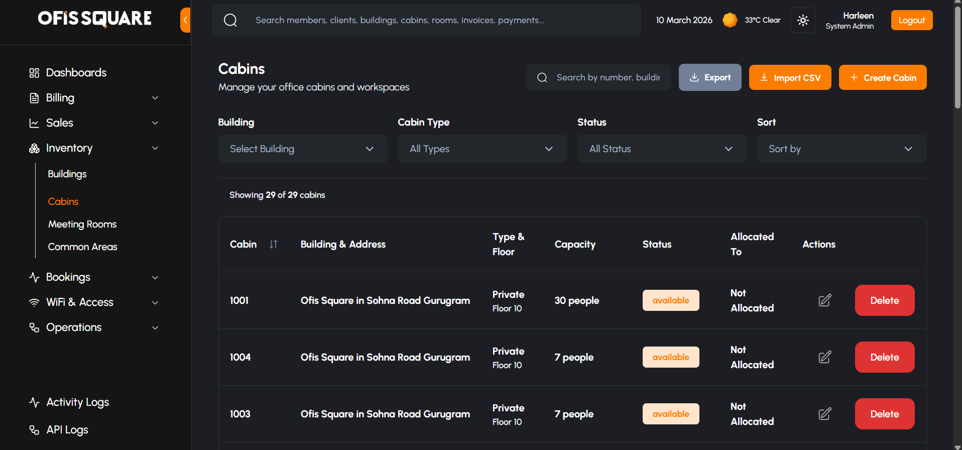 The Admin Panel provides complete hierarchical control over the physical workspace, organized logically from Buildings down to individual Cabins, Meeting Rooms, and Common Areas.
