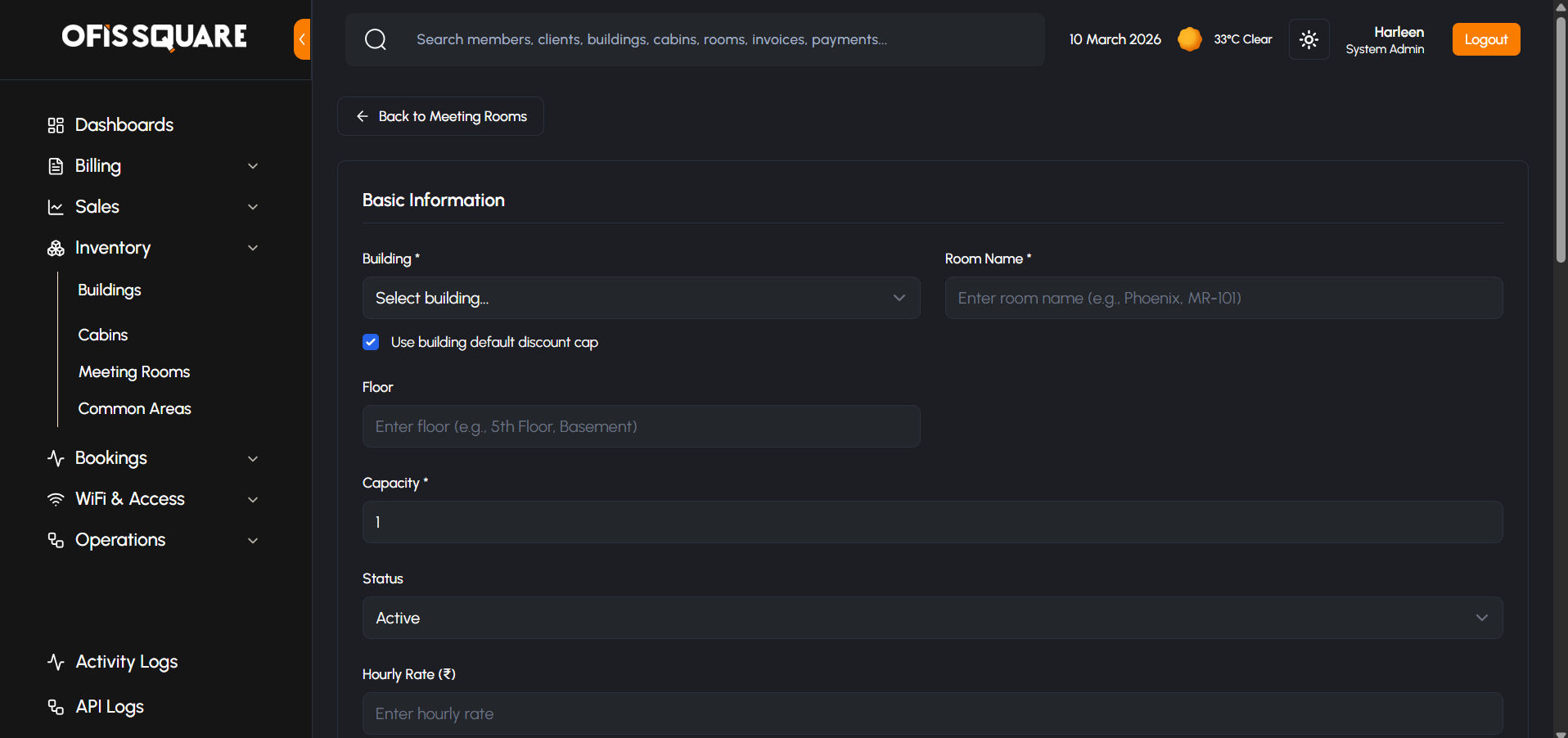 - Capacity & Pricing: Defines seat capacity and fixed Hourly Rate. Admins can choose to enforce the Building's global discount cap or specify a custom, room-level discount limit.