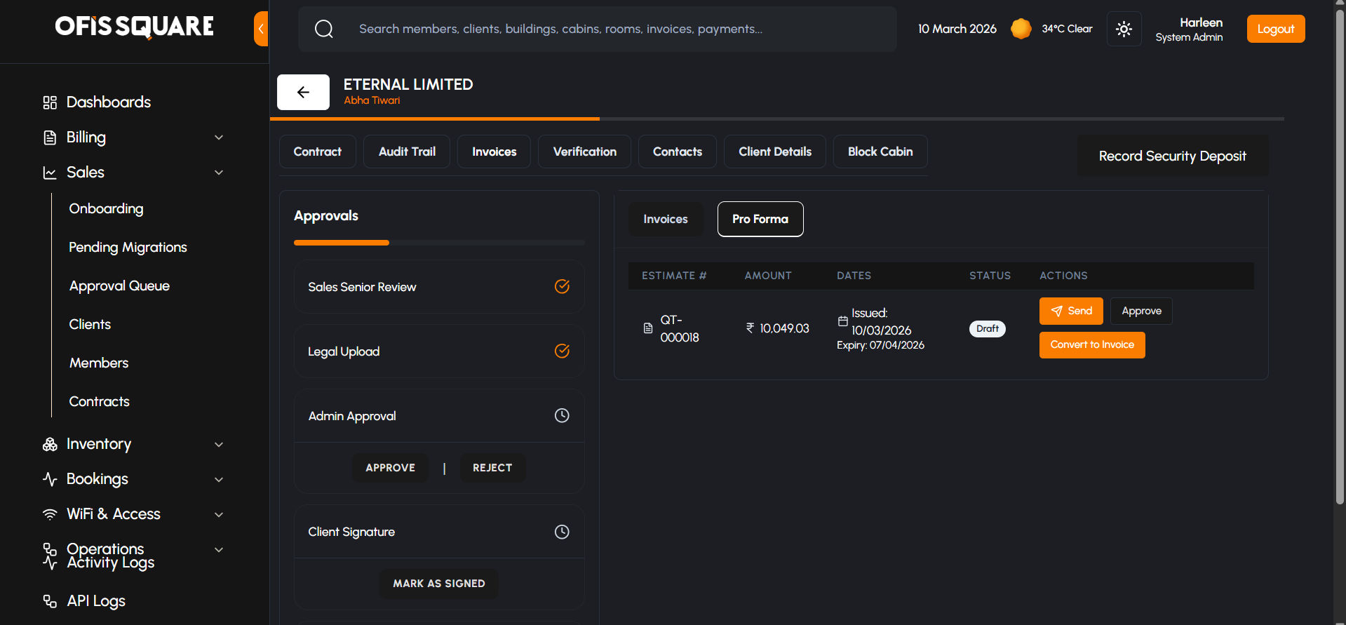 - Sales Senior Review: The Sales Senior logs in, navigates to their Approval Queue, and reviews the financials, dates, and terms.