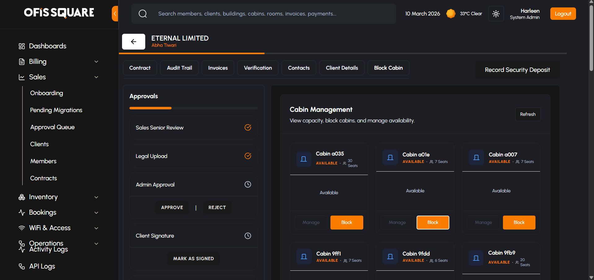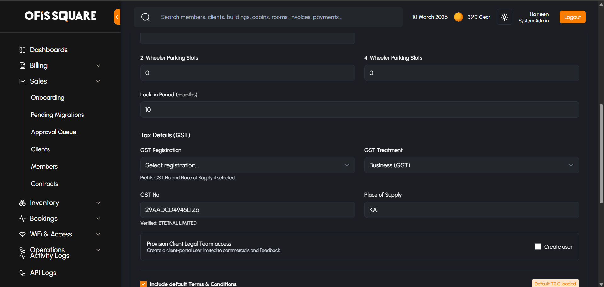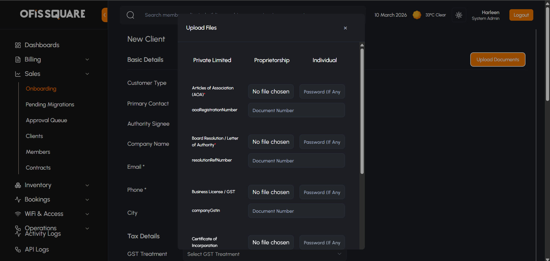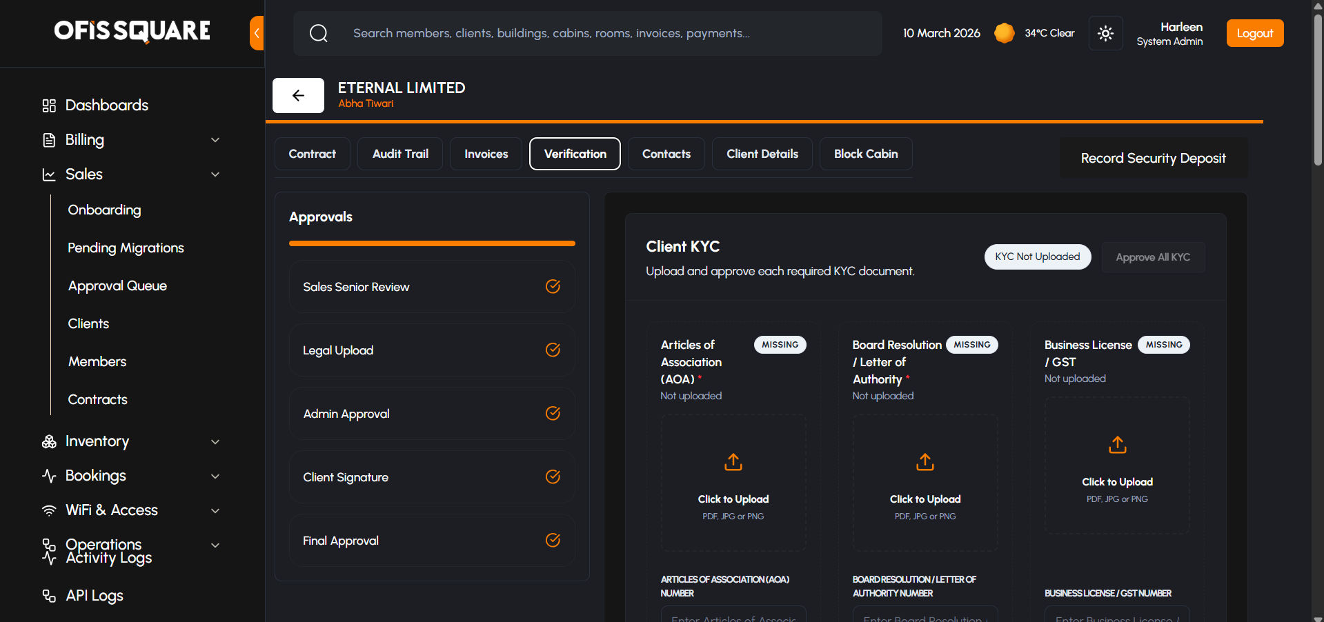 For larger enterprise clients (e.g., those taking a Private Cabin or bulk desks), the onboarding process is highly structured. It involves capturing precise billing data, dynamic document collection, and a strict multi-tier approval process.