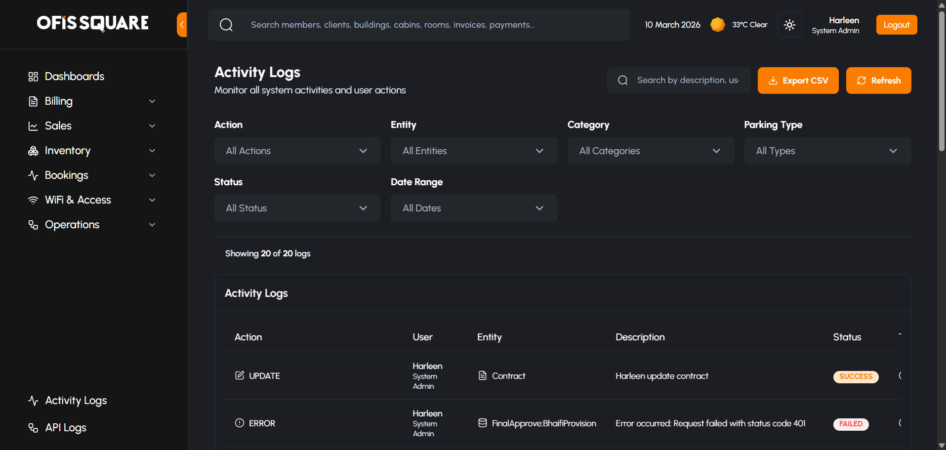 - Entity-Based Tracking: Actions are categorized by the target entity (e.g., Client, Invoice, Contract, or Parking).