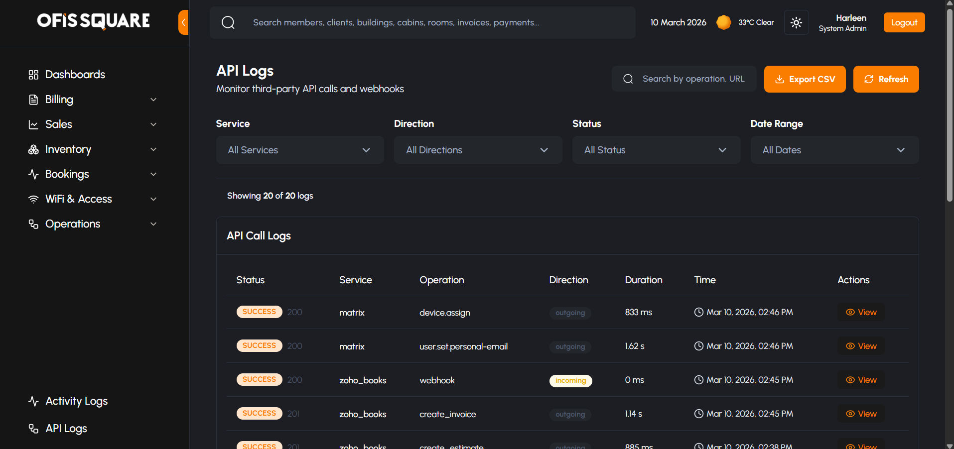 The API Call Logs is a technical diagnostic tool used to monitor the health of third-party integrations. It captures the raw data flowing between Ofis Square and external services like Zoho Books, Zoho Sign, Razorpay, and SMS Waale.