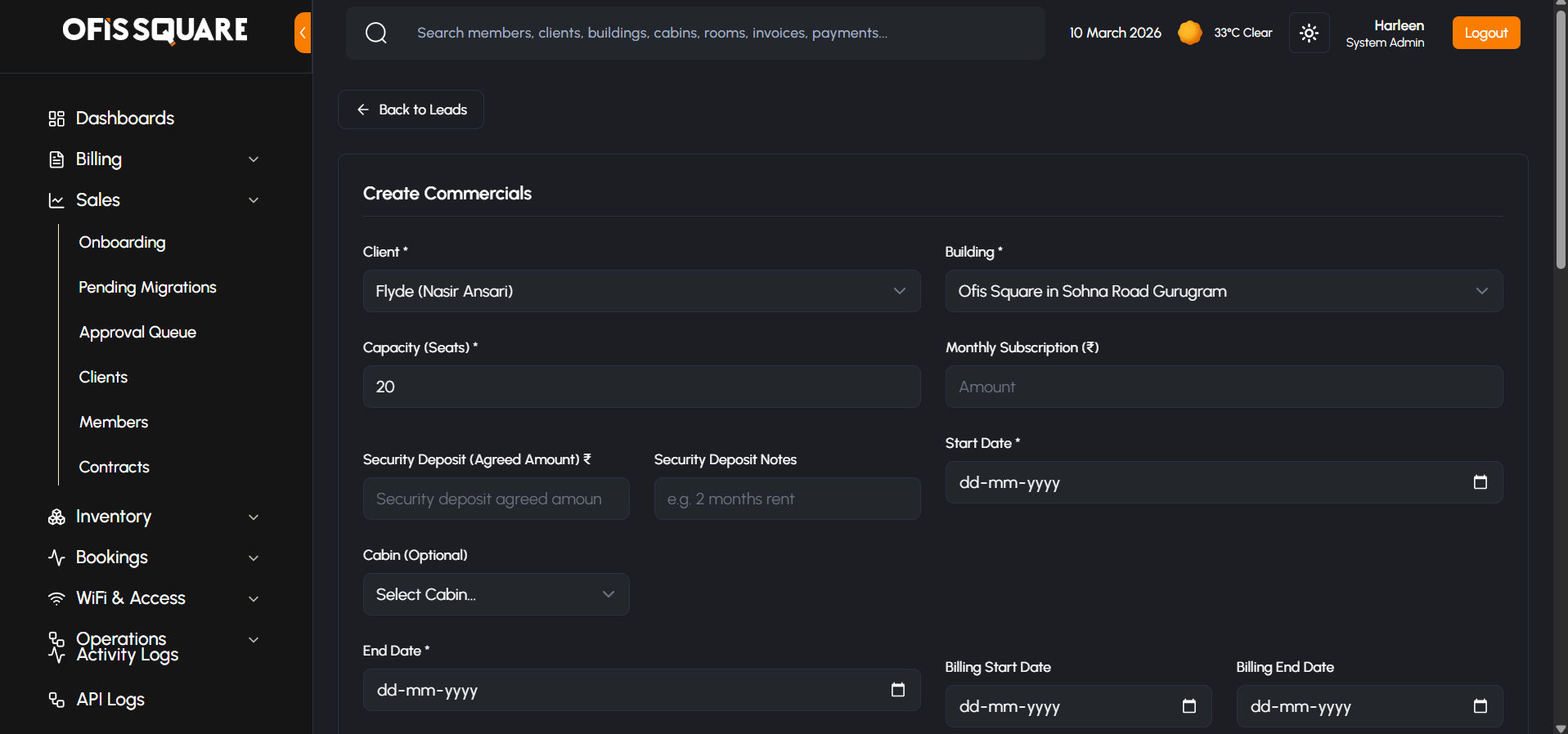 Once the Client profile is established, the representative must formally submit the financial terms of the deal via the Commercials Form. This is typically handled by a Sales Junior role.