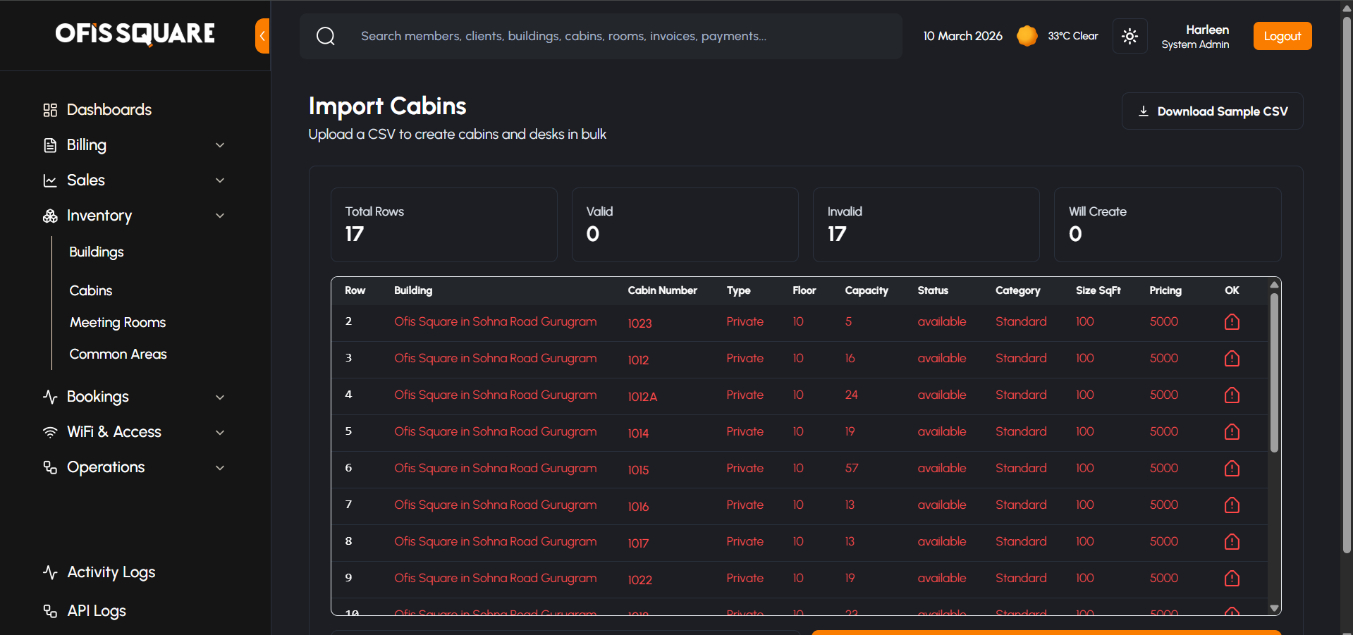 To facilitate rapid onboarding of large locations, the Admin Panel features a sophisticated, fail-safe CSV import workflow for Cabins, Meeting Rooms, and Common Areas.