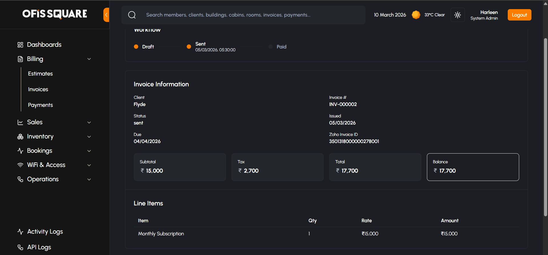 - Stage 3: Tax Conversion (Tax Invoice Conversion Date): On the first date of the actual billing month, the system converts all "Sent" Pro-Formas into official Tax Invoices, generating final invoice numbers and syncing them with Zoho Books.