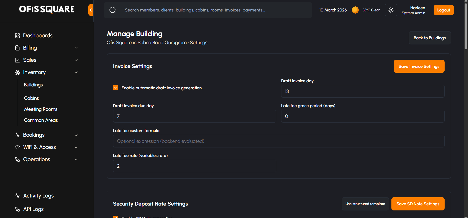 - Granular billing configurations: Draft Invoice Generation Cycles, Due Days, and Security Deposit Thresholds.