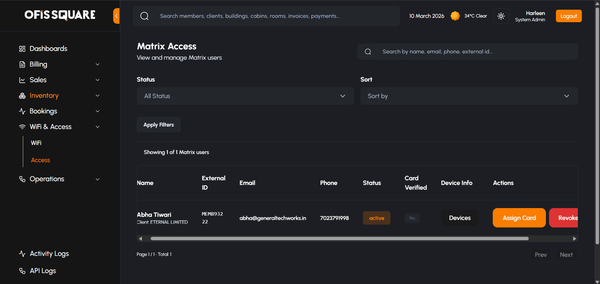 The Matrix Access module manages the physical entry permissions for all members across the building's secured zones (Cabins, Meeting Rooms, and Main Entrances).
