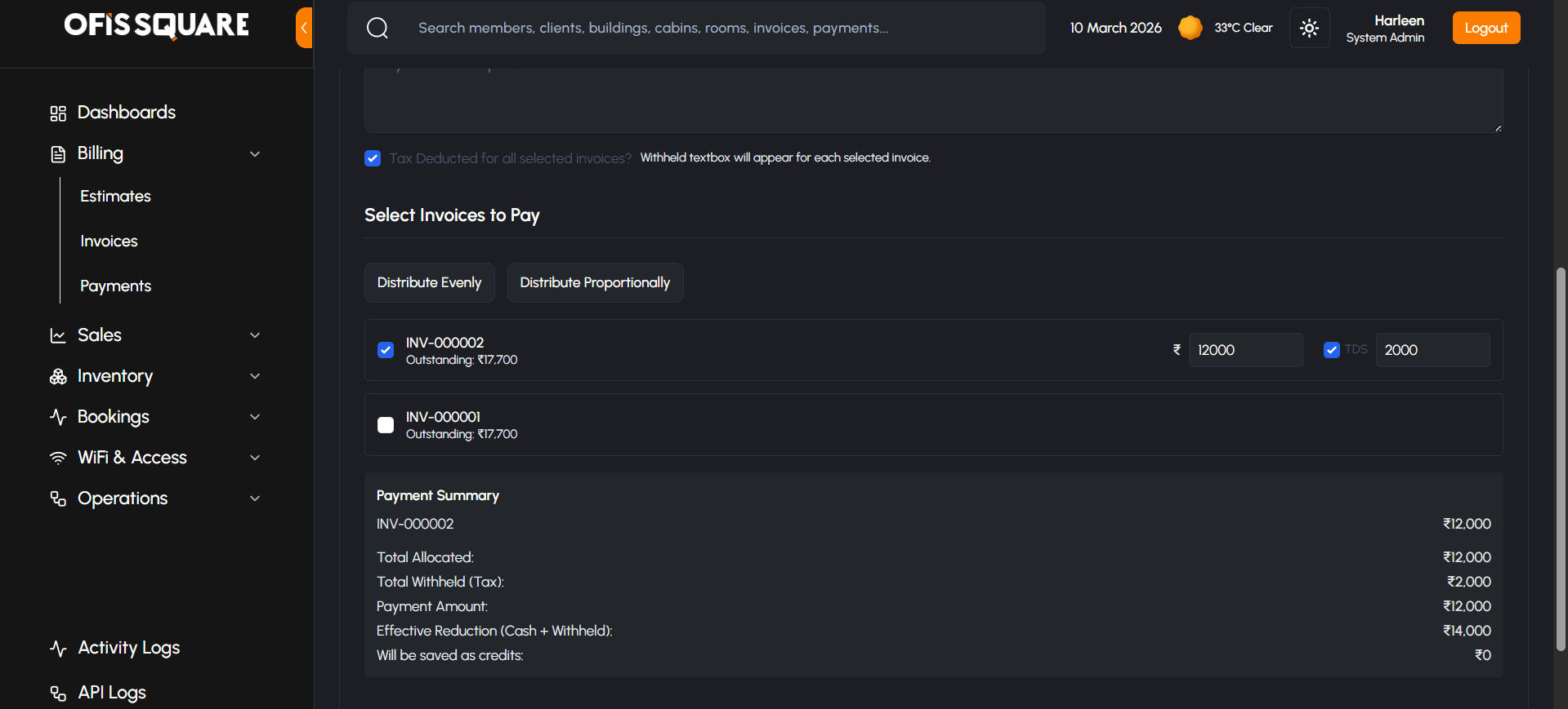 - Tax Withheld (TDS): Administrators can check the TDS toggle for any invoice. This allows them to enter the exact tax amount the client withheld (typically 2% or 10%).