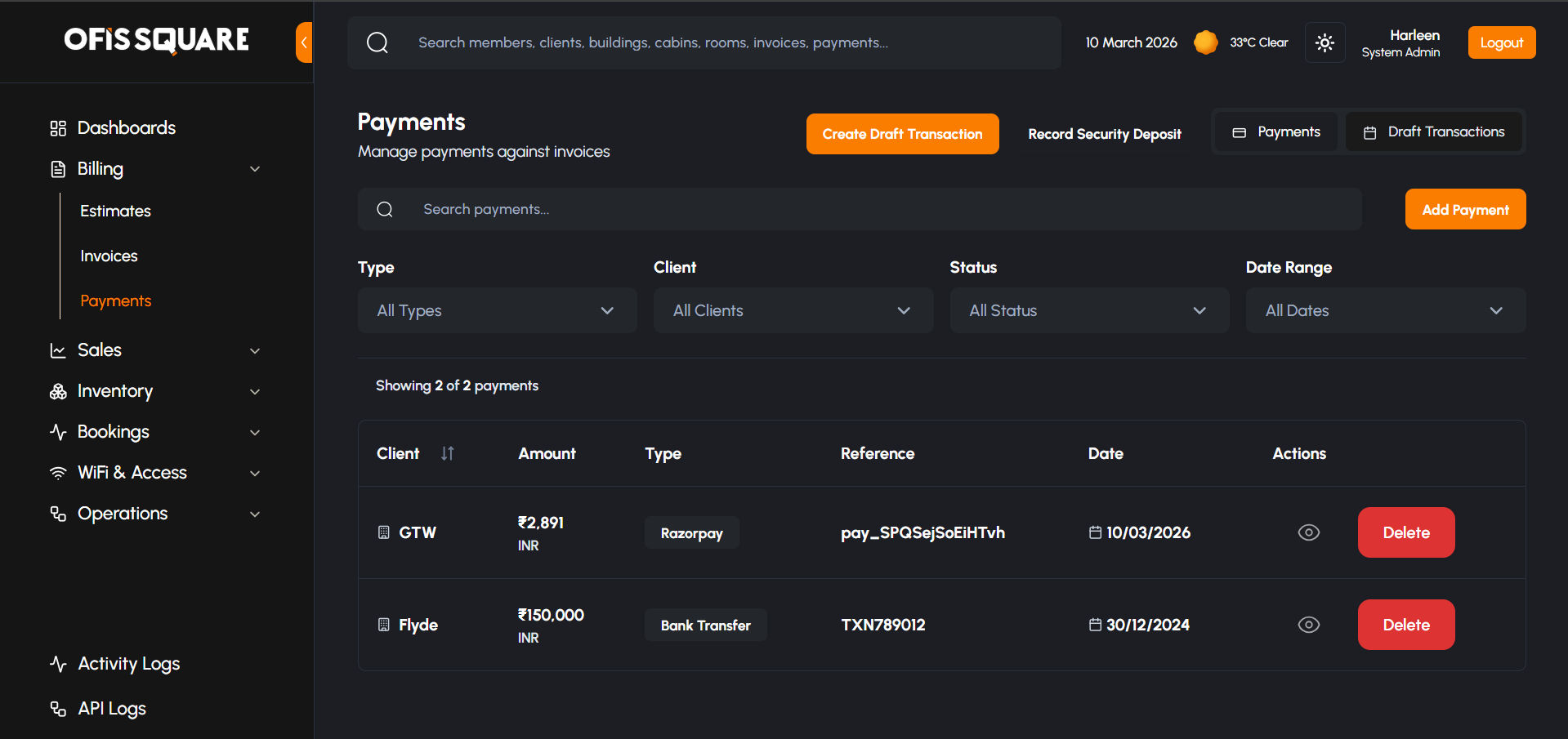 The Payments module acts as the financial bridge between the bank and the ledger. It handles the nuances of Indian tax compliance and client overpayments.